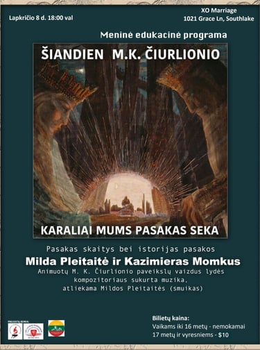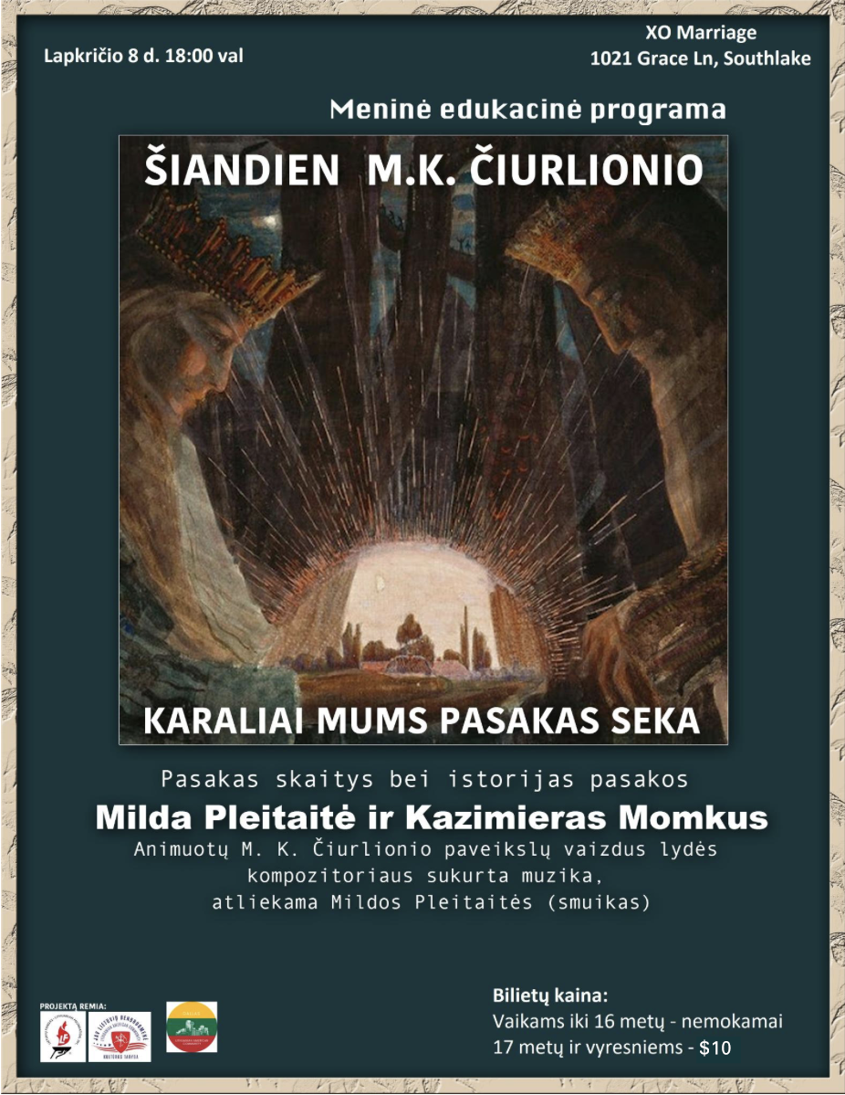 Lapkričio 8 d., šeštadienį, 18 val. kviečiame jus į ypatingą vakarą, kurio metu vyks Čiurlionio edukacinė ir meninė programa „Šiandien karaliai Čiurlionio pasakas seka“, pristatoma menininkų Mildos Pleitaitės ir Kazimiero Momkaus.